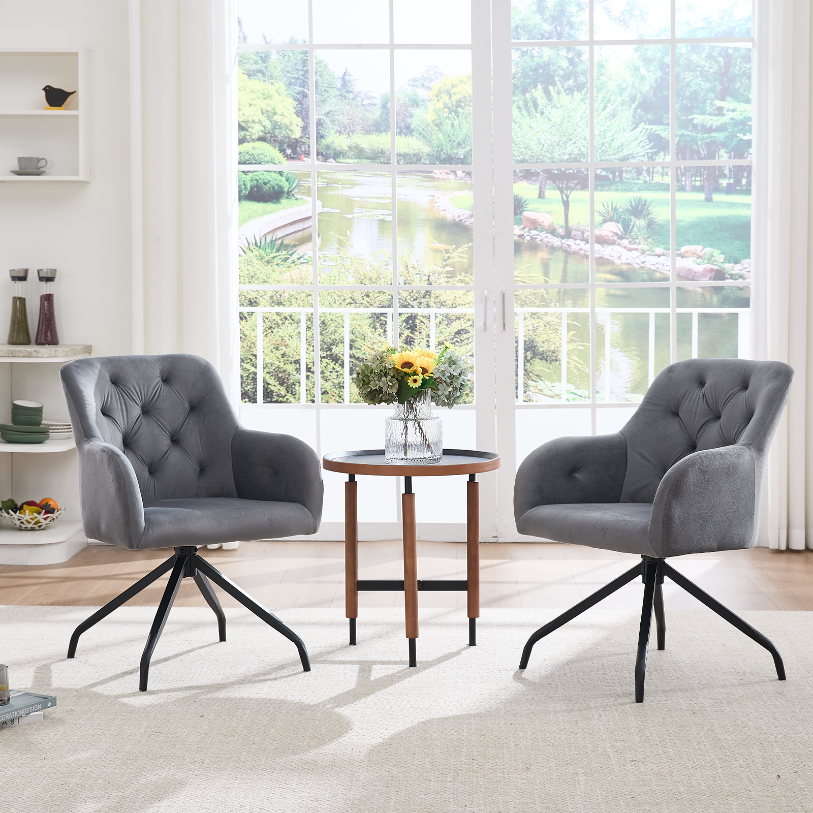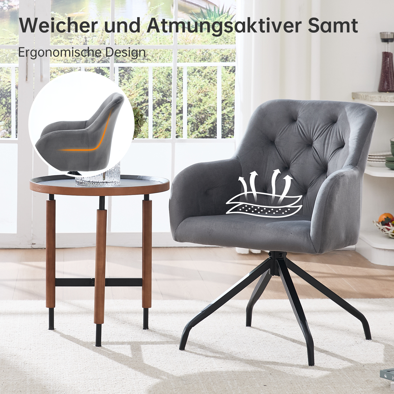 FUNKTIONALITÄT IM ALLTAG: Dank 360-Grad-Drehfunktion auf dem schwarzen Gestell ist der Stuhl besonders alltagstauglich – ob beim Platznehmen, Aufstehen oder bei geselligen Gesprächen.